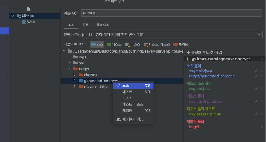 파일 → 프로젝트 구조 → 모듈 (좌측 메뉴바) → target/generated-sources 폴더가 처음에는 ‘제외’로 설정이 되어 있는데, 이것을 우클릭해서 ‘소스’로 선택해서 적용하면 된다.