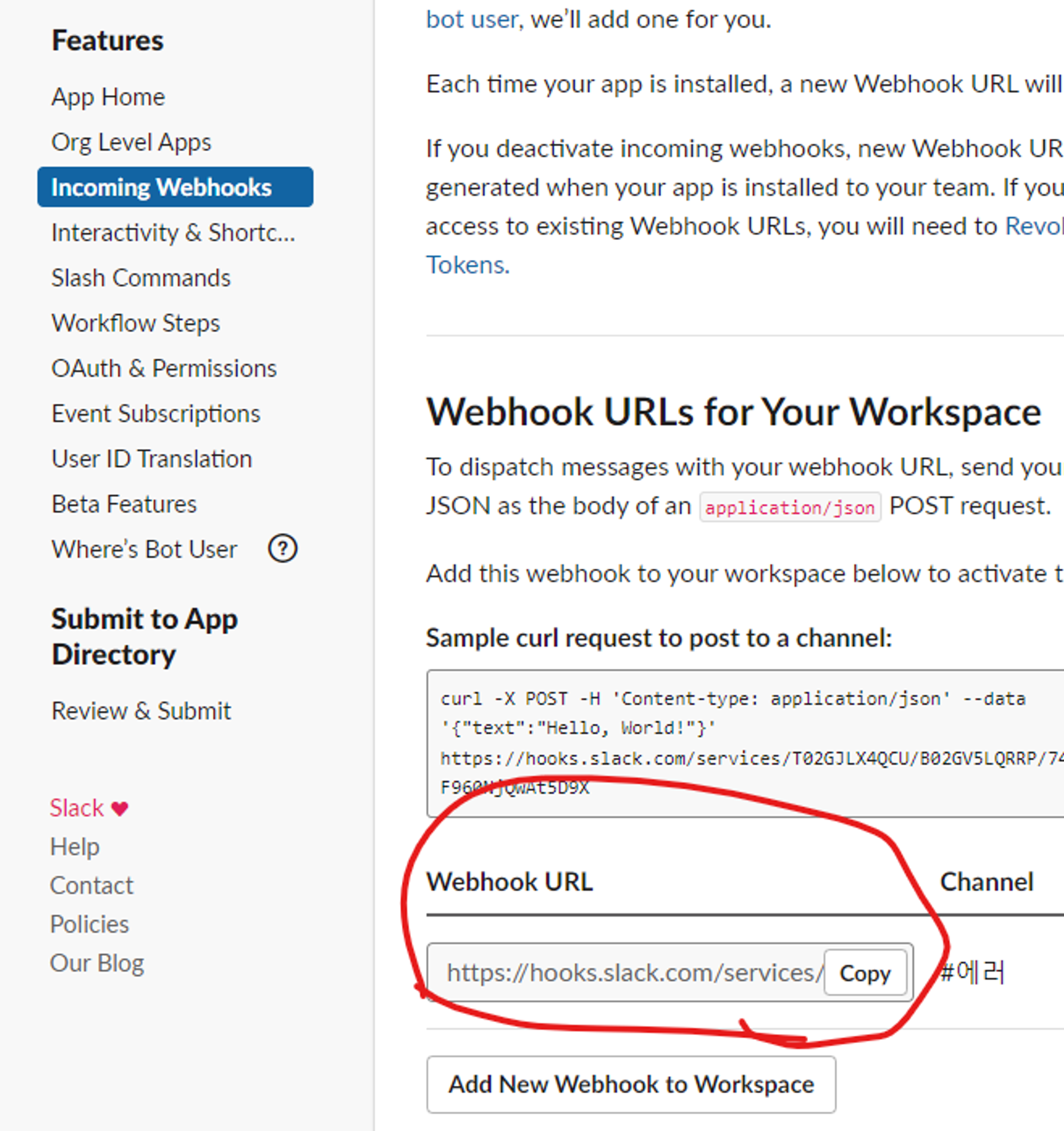 왼쪽의 Features에서 Incoming WebHooks를 선택하고 Url을 받는다.